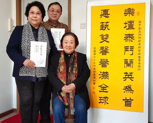 大师弟子、第三代白毛女扮演者、两度戏曲梅花奖获得者刘玉玲和著名书法家孟庆利献“乐坛泰斗兰英为首德艺双馨誉满全球”书法作品,祝贺恩师音乐会圆满成功,并祝九十高龄的郭兰英先生健康长寿,艺术青春永驻。