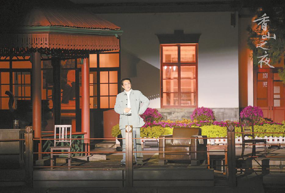 9月27日傍晚6点半,夜色低沉,灯光亮起,香山公园双清别墅的庭院里响起了悠扬的北京人艺开场钟声。由演员王斑和方旭分别扮演的毛泽东与蒋介石,穿过六角亭,来到池水边,在苍松翠柏环绕、天地为舞台的露天环境中,展开了一场“超时空的心灵对话”。北京人艺重大革命历史题材话剧《香山之夜》,也首次以这样的实景演出方式在“香山之夜”上演。这是北京人艺历史上第一次实景演出,也是香山公园首次举办实景话剧演出。