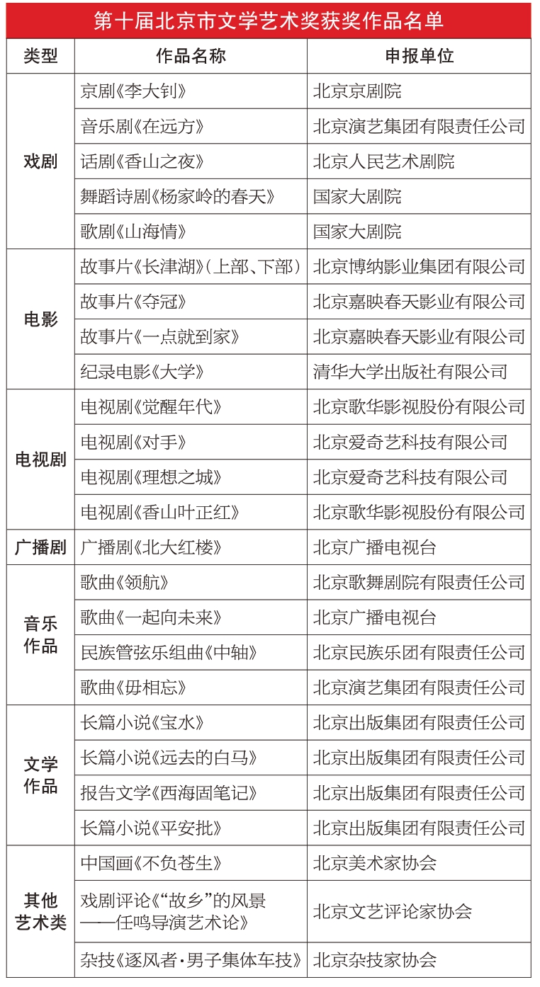 北京市文学艺术奖由市委、市政府设立,每2年评选表彰1次,是北京市文学艺术界最高奖。本届推选出25部优秀作品,涵盖戏剧、电影、电视剧、广播剧、音乐、文学以及其他艺术类作品等;第十六届精神文明建设“五个一工程”评选则共有11部北京作品入选,获奖作品和总分名列各省区市首位,创造了历史最好成绩,这也是北京市连续三届获奖作品数量和总分名列各省区市首位。