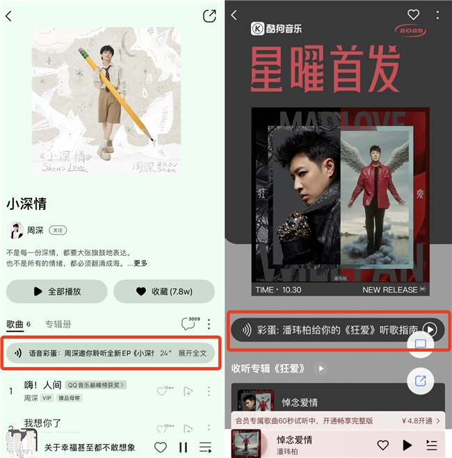 近日,QQ音乐、酷狗音乐接连推出“专辑语音彩蛋”功能,通过明星独家语音内容与音乐作品的深度融合,为乐迷带来更沉浸、更具情感连接的音乐体验。